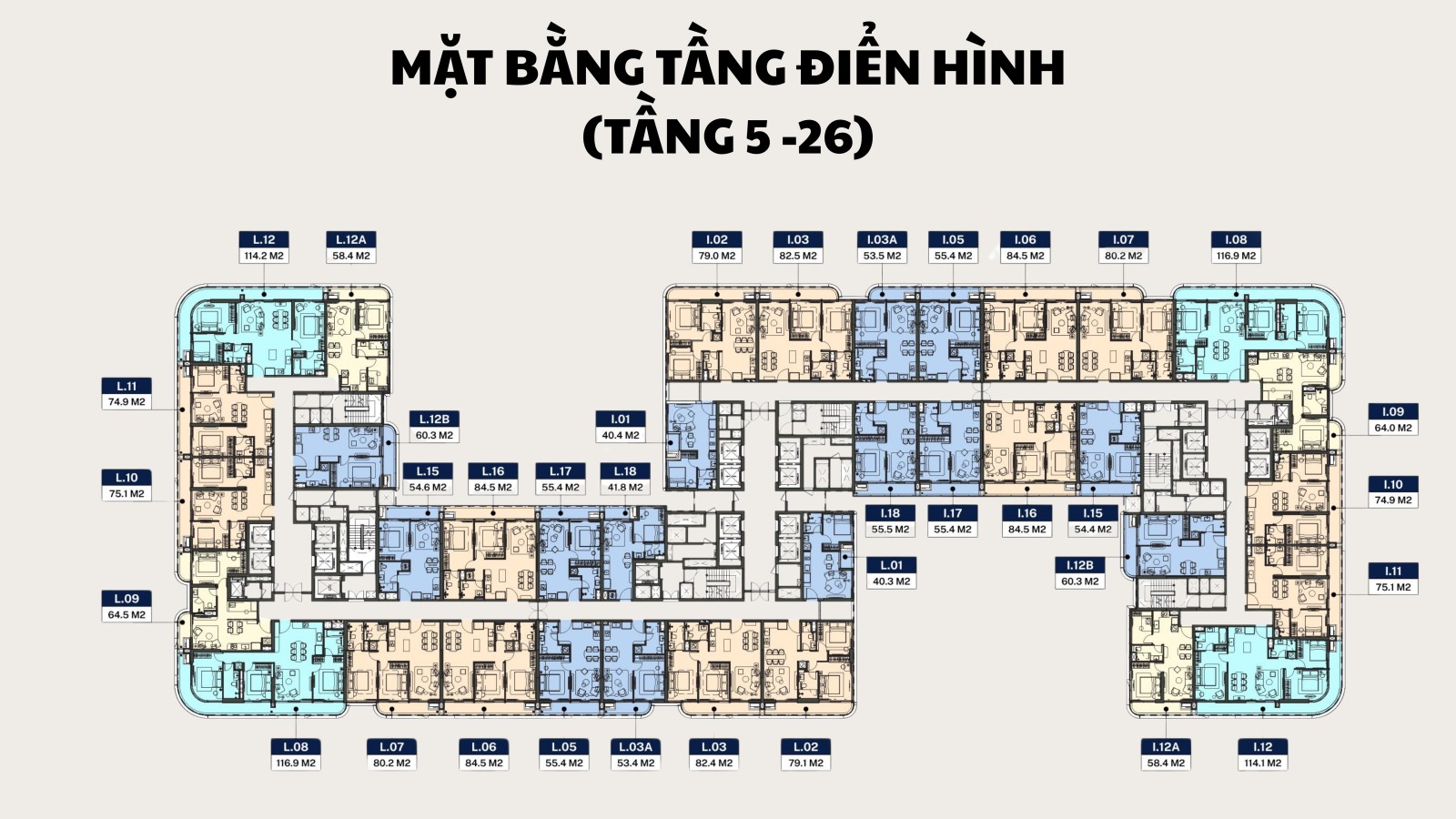 Loại 1 P. ngủ : 308 căn , diện tích : 40 - 55 m2